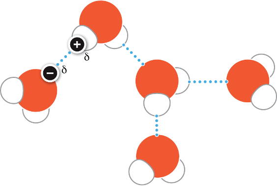 The dotted lines in this diagram are weak ________ bonds due to attraction of partially charged regions between water molecules.